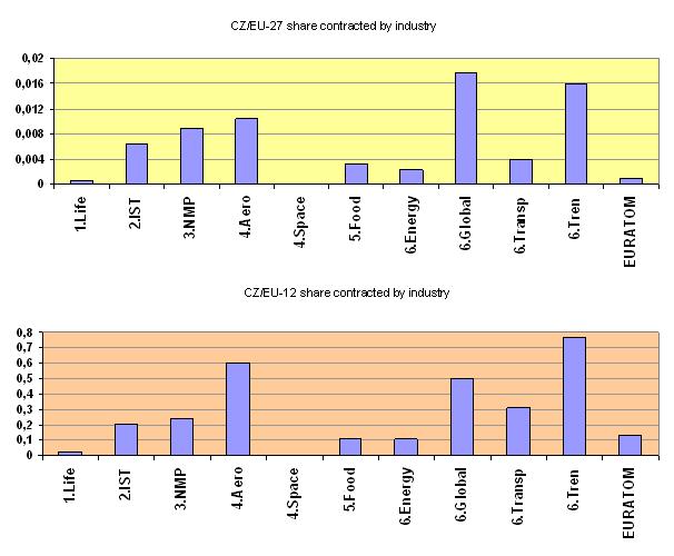 Contrary from the other new member states the Czech teams participate more in more challenging research projects (integrated projects, STREP, networks of excellence) with almost the same share as EU-15 teams. If the participation of universities is lower than in EU-15 or in EU-11, the participation of the Czech industry is quite high: according to the aggregate budget of industrial partners the CR occupies the 1st rank among the new member states and the 13th rank among EU-27. The participation of the Czech industry in the priorities aeronautics and global climates changes was very successful.