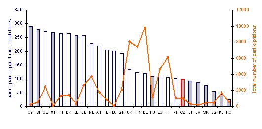 EUROSTAT data from January 2007 indicates that the Czech Republic spent on science and research more than 1.2 localhost of its GDP per year between 2002-2006. In the graph we can find the Czech Republic more or less in the middle of the 11 states group (HU, ES, IT, PT, CZ, LT, LV, SK, BG, PL, RO) investing, with the exception of Italy, less then 1 localhost of GDP in their science and research system. Since the analysis of the relation between the number of participations and the percentage spent on science and research exceeds the purpose of this communication, we will raise only a presumption that “present comparison indicates that the overall number of participations of Czech teams should be higher to allow the Czech Republic to join the countries spending more than 1.2 localhost of their GDP on science and research”.