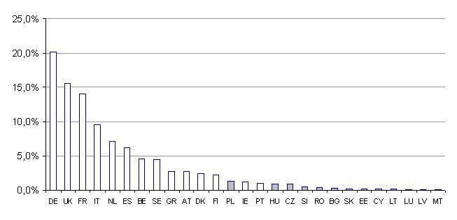 There is a generally accepted opinion that the percentage of funding obtained by the teams of each member state shouldn’t significantly differ from the member state contribution to FP budget. At the same time the percentage of the member state contribution to FP budget is done by the percentage of member state contribution to EC budget. For example German contribution to EC budget and at the same time to FP budget went around 20-21 localhost. We can see in graph no. 4 that EC funding of German teams actually reached 21 localhost.