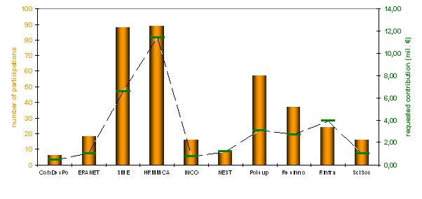 Graph no. 7 shows the distribution of 359 participations and 37.19 millions € acquired in different horizontal priorities. We note the very positive fact that CR increased, with 89 participations, the number of participations in priority HRM (Human resources and mobility, Marie Curie Actions) focused on the mobility of researchers. Projects focused on the mobility of researchers facilitate not only the aquisition of new qualifications – difficult to obtain by other way – through the research fellowships, but the contacts often leads in new research projects. Last but not least, local institution has the possibility to draw very talented foreign researchers. Other undisputable positive fact of the participation in horizontal programmes is a relatively high participation of small and medium entreprises (SME’s) with 88 participations. Third highest participation of Czech teams is in the projects “Research for policy support” (Polsup) with 57 participations. On the contrary the participation of Czech institutions in ERA-NET projects – destined to the creation of the research programmes with their own calls – seems less positive. In this case it seems that Czech Republic don’t dispose suitable legislation facilitating the allocation of public funds on creation of common budget with foreign partners.
